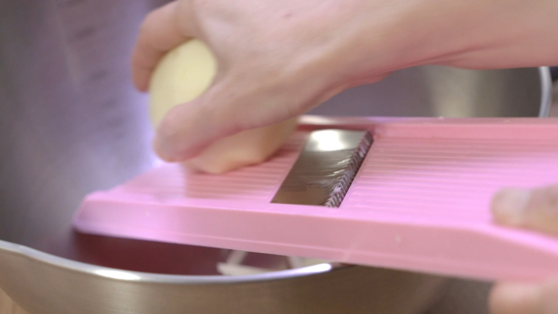 이제 채판을 준비해서 감자를 모두 채썰어 주세요. 손으로 직접 채썰어 주셔도 좋아요.