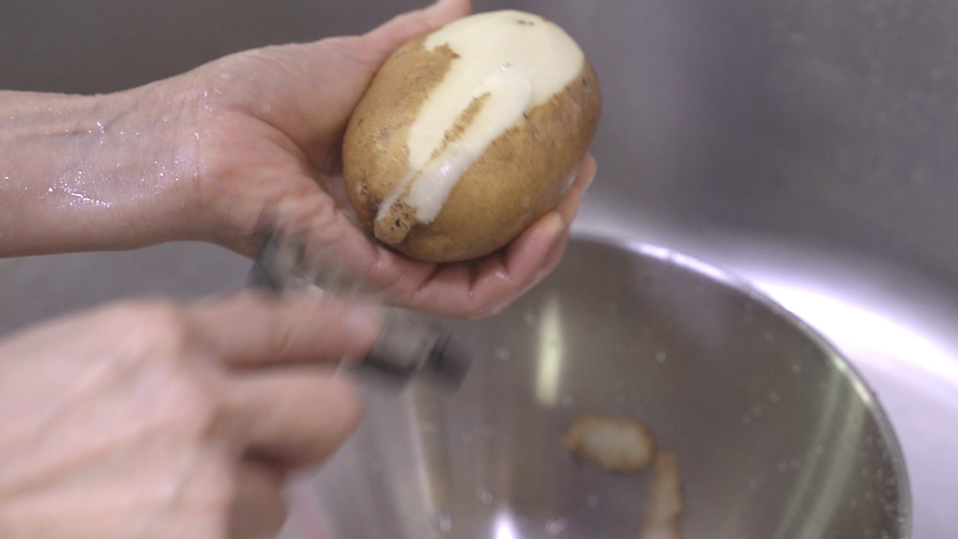 먼저 신선한 큰 감자 한개를 준비해 주세요. 그리고 감자 껍질을 모두 제거해 줍니다. 감자 1개면 1~2인분 정도 먹을 양이 나오게 돼요.