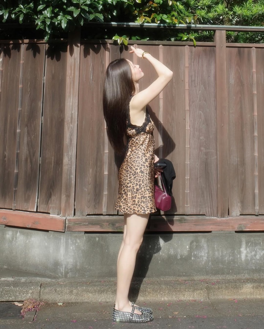 또 다른 컷에서는 레오파드 패턴 슬립 드레스를 입고 거리를 걷는 모습이 담겼다. 깊게 파인 네크라인과 레이스 디테일이 더해져 섹시하면서도 대담한 분위기를 자아냈다. 여기에 길게 뻗은 각선미와 시크한 표정이 더해져 압도적인 카리스마를 완성했다.