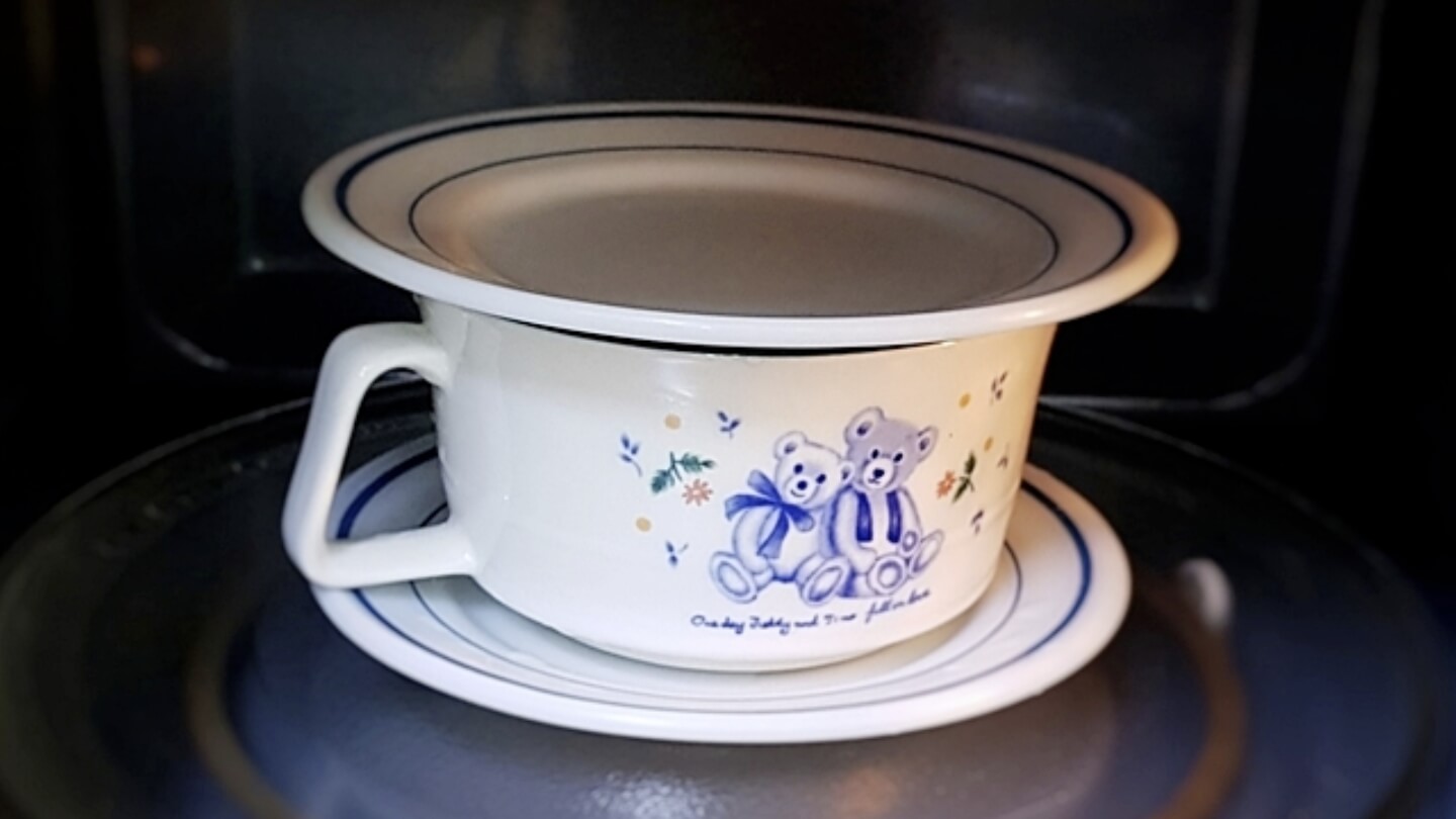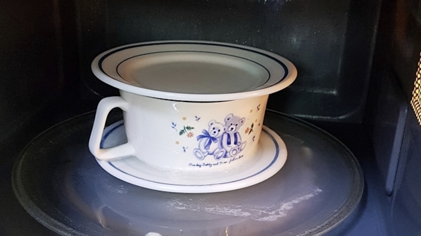 먼저 가열하기에 앞서 그냥 하면 물이 넘칠 수 있어요. 그래서 이때 반드시 위 아래로 접시를 깔아 준비하는 것이 중요해요.
