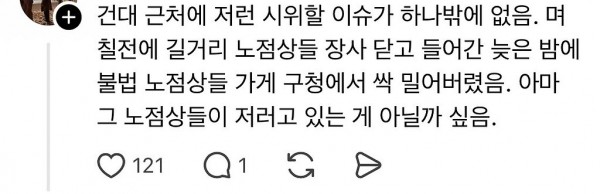 저기 교통량엄청 높은데 한가운데 누워있음 아마 며칠 전에 노점상 싹다 밀어버렸는데 그 시위로 추측됨 현재 ㅈㄹ났다는 펄어비스의 붉은 사막국내 맥주 1위 카스의 화끈한 영업 전략요즘 카톡 쇼츠 보는 사람들 공감일본의 신개념 결혼 문화 등장(스포) 원피스 최신화에 밝혀진 레일리 & 샤키 스토리