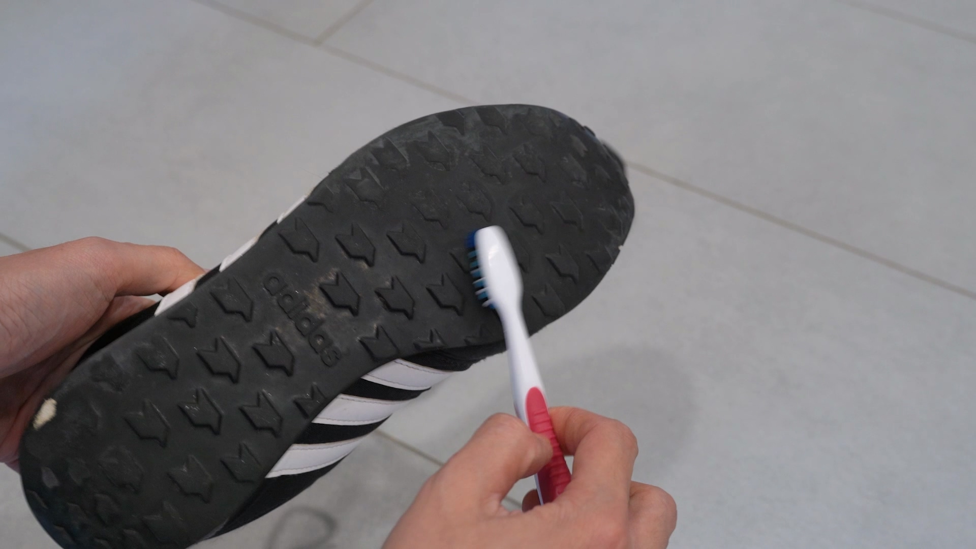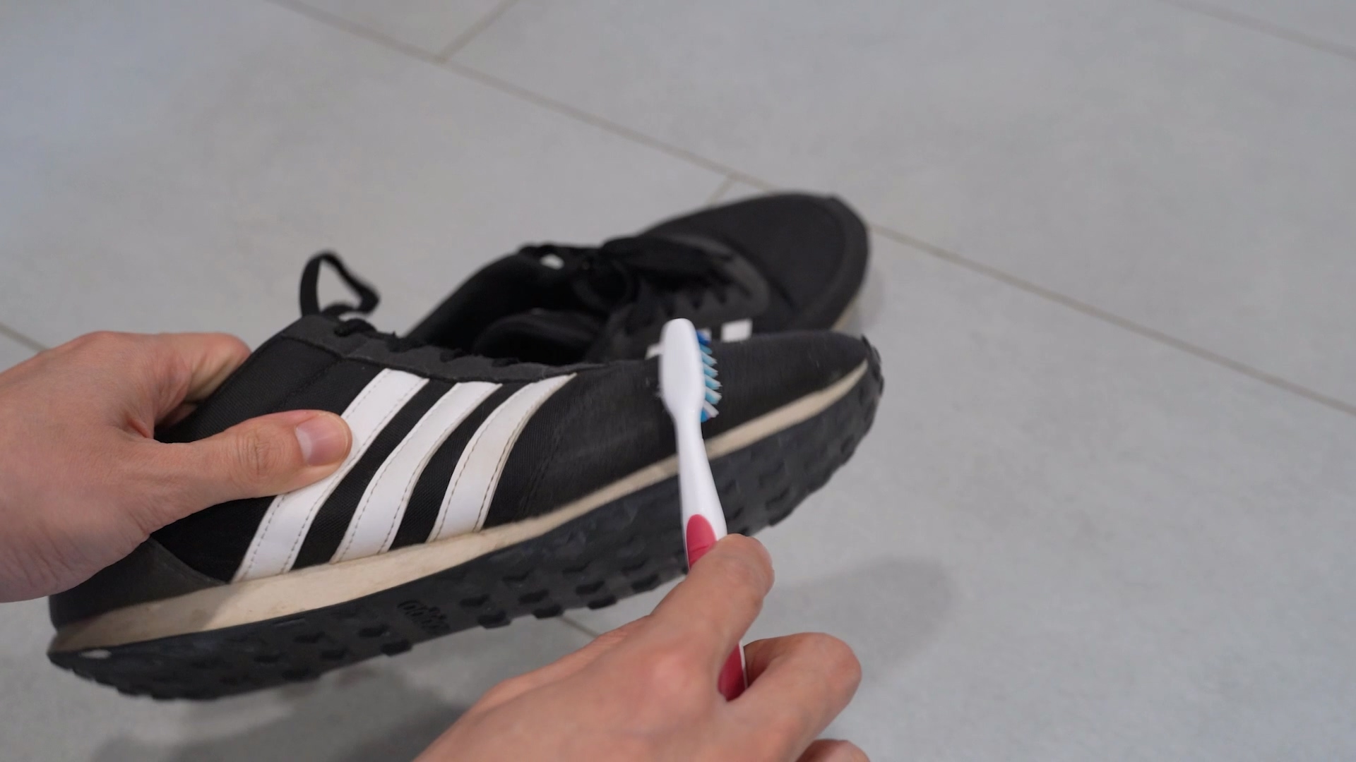 신발 밑창, 겉면 등 다쓴 칫솔을 이용해 문질러 닦아 주면 돼요.