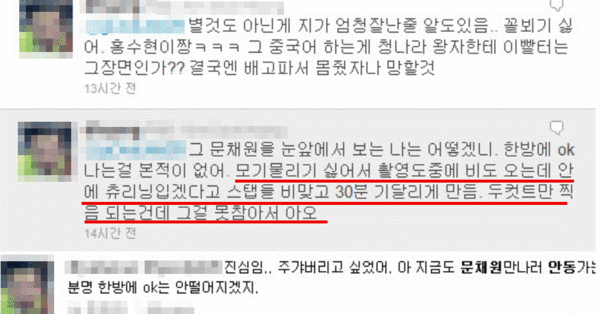 당시 문채원과 촬영을 했다고 주장한 한 스태프는, 문채원이 촬영 시간에 늦거나 준비가 미흡해 대기 시간을 길게 만들었다고 전했어요.