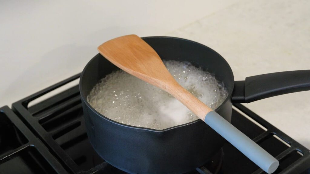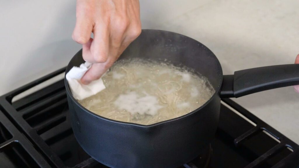 이렇게 식용유를 가장자리에 바르게 되면 국수 거품이 끓어 넘치는 것을 막아 안심하고 끓일 수 있어 좋아요!