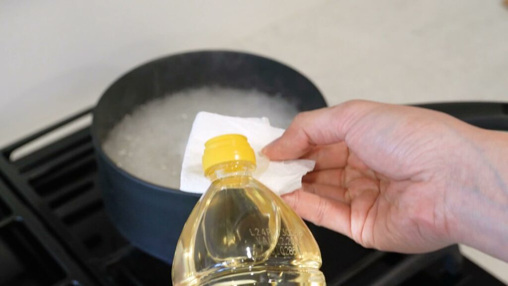 이제는 나무 국자가 아닌 식용유를 활용해 보세요. 먼저 키친타월에 식용유 적당량을 묻혀 주세요.
