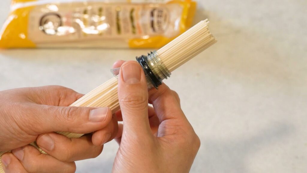 이제 매번 양 조절에 실패하지 마시고, 페트병 입구에 국수를 끼워 확인 후 끓이세요. 그러면 간편하게 실패 없이 항상 국수 1인분 양을 맞출 수 있답니다.
