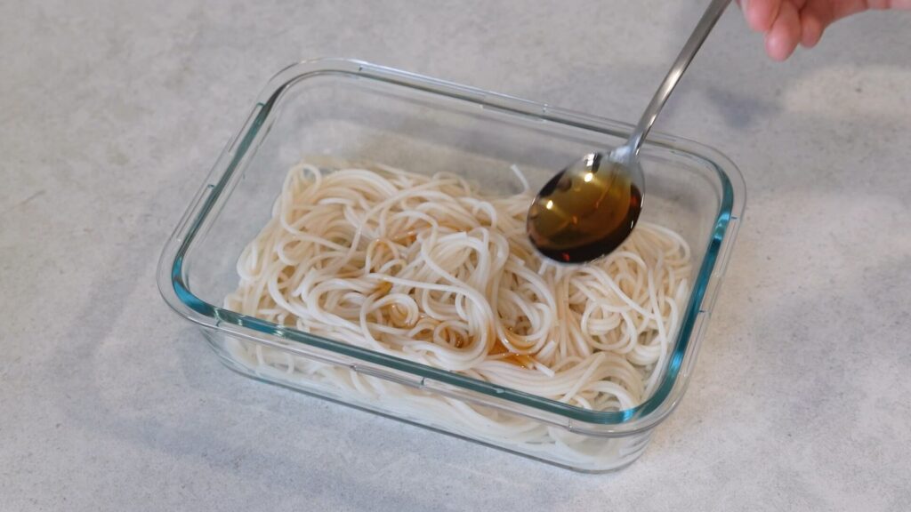 이제는 참기름 한 스푼을 둘러 섞어 보세요. 이렇게 하면 국수 면발에 참기름 코팅이 되는데요. 그래서 냉장 보관 후에도 서로 달라붙지 않고 쉽게 풀어지는 것을 보실 수 있을 거예요.