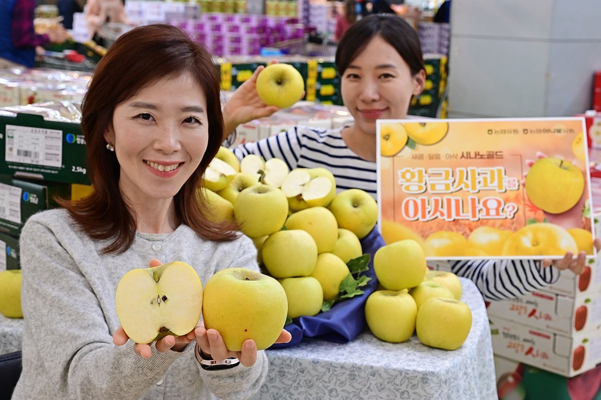 충북 영동에서 황금빛 사과 '시나노골드'가 올해 처음으로 수확됐다. 7년 간의 시범 재배 끝에 거둔 성과다.