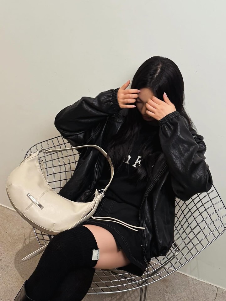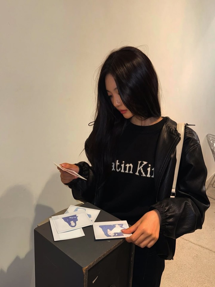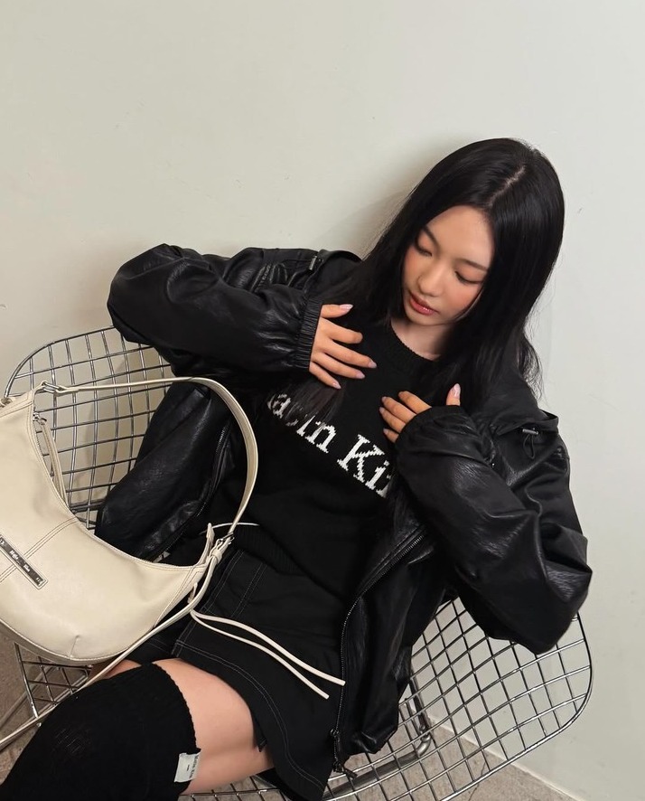 공개된 사진에서 닝닝은 블랙 니트와 가죽 재킷, 그리고 미니스커트를 매치해 도회적인 스타일을 완성했다.