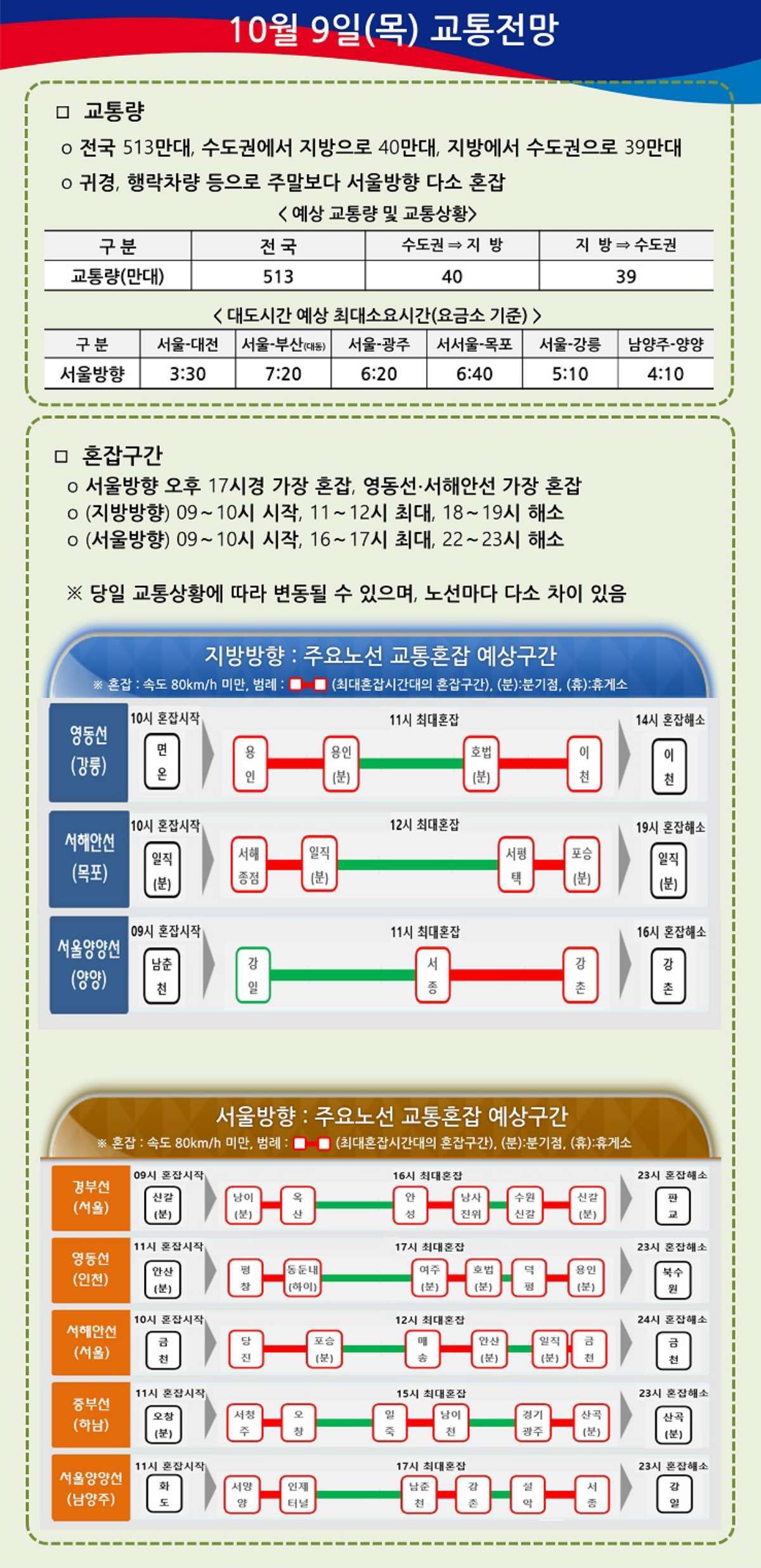 오전 9시 기준 요금소 출발 기준 지방에서 서울까지 소요 시간은 부산 6시간 40분, 울산 5시간 30분, 대구 4시간 50분, 광주 4시간 10분, 목포 5시간 40분, 강릉 3시간, 양양 2시간, 대전 1시간 50분으로 집계됐다.