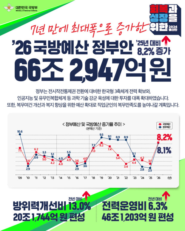 지난 8월말 정부는 내년도 국방예산을 약 66조원 규모로 편성했다. 2025년 대비 약 5조원 증액인데, 전체 국방예산뿐 아니라 전년 대비 증액분도 최대 수준이다.