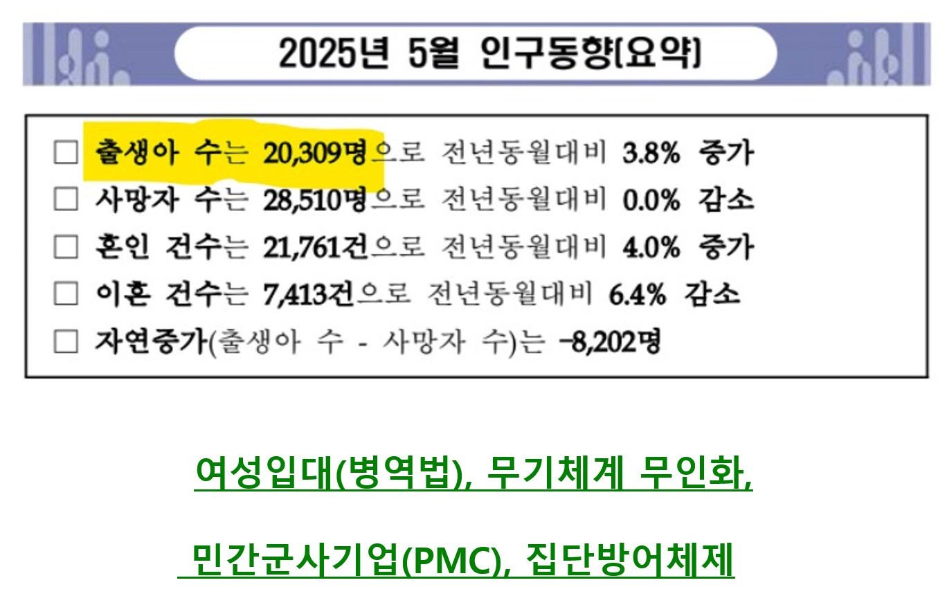 그렇다고 해서 우리가 과거에 익숙했던 ‘국군 60만명’이라는 숫자를 회복하는건 불가능하다. 통계청이 최근 발표한 ‘2025년 5월 인구동향’에 따르면, 2025년 5월 출생아 수는 전년보다 일부 증가했지만 20,309명이다. 2024년 탄생한 신생아는 총 238,343명이었다. 산술적으로 입대할 수 있는 남성(아들)은 1년 약 12만명이지만, 실제 병역자원은 여러 사정으로 인하여 더 줄어들 수밖에 없다.