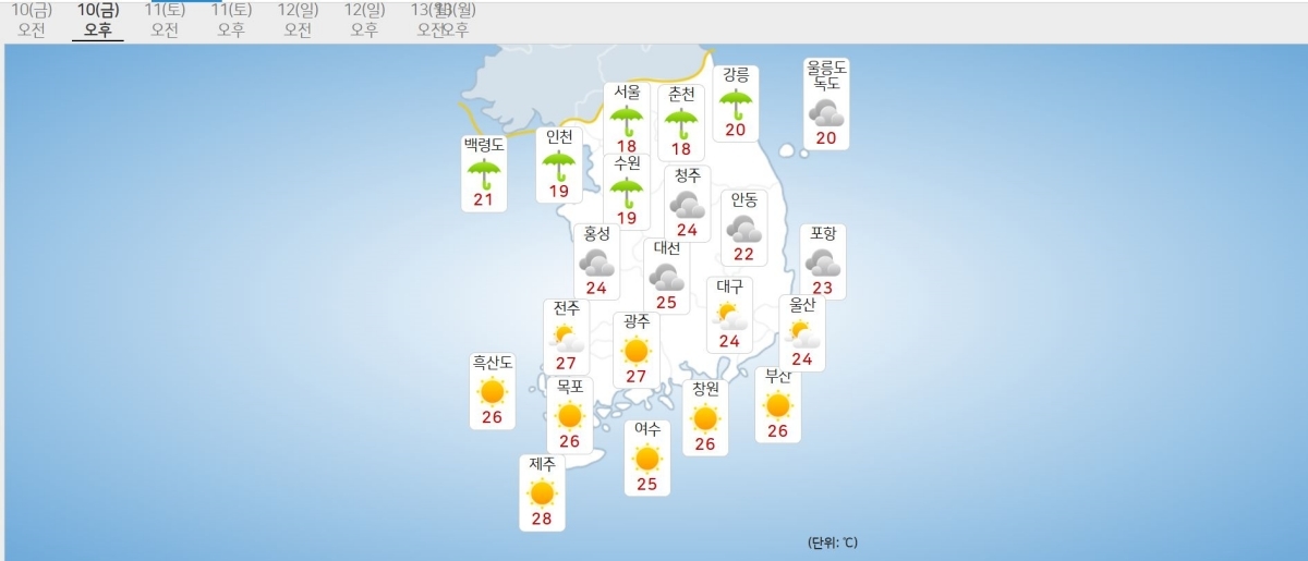추석 연휴가 끝난 금요일인 오늘(10일)은 전국이 대체로 흐린 가운데 수도권과 강원 지역을 중심으로 비가 이어질 전망이다. 서울의 낮 기온은 18도로 선선한 가을 날씨가 나타날 것으로 보인다.