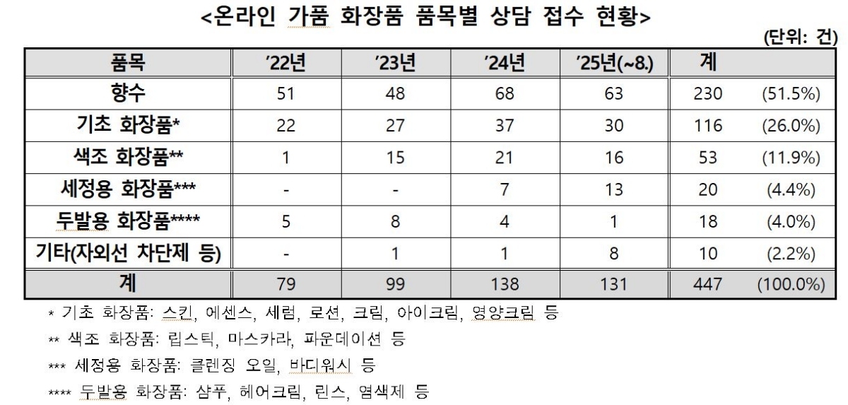 품목별로는 향수가 절반 이상을 차지했다. 세부적으로는 향수가 230건, 기초 화장품이 116건, 색조 화장품이 53건으로 뒤를 이었고 세정제나 샴푸 같은 생활용 제품도 적지 않았다. 특히 기초 제품과 색조 화장품은 매년 상담 건수가 계속 늘고 있다는 점에서 주의가 필요하다.