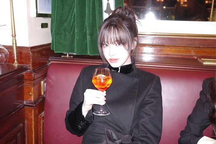 또한, 유리잔 너머로 비치는 미묘한 미소와 깊은 눈빛은 우아함과 시크한 매력을 모두 보여주며 한편의 영화 속 장면을 떠오르게 했다.