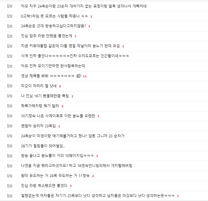 8분부터 나솔사계에 남자들이 23옥순한테 관심 오짐 23옥은 당연히 연프니까 남출들 알아보기 시작 다른 여출들 자기 픽 남출이 23옥이 1순위니까 23옥한테 노선정리 언제되냐 재촉 23옥은 감정선이 ㄹㅇ 복잡해서 고민 엄청함 그러니까 다른 여출들이 23옥이 질질 끈다, 어장친다, 이건 예의가 아니다 정치질 시작 10페이지 이상 달리는 중 피디도 추악했는지 편집 안하고 다 내보냄 짱깨 섞여있는 걸그룹 화들짝... 일본인 아이돌 한복 자태연예인들이 행사비 달라고 하면 욕 먹는다는 행사업계강연금 작가의 '황천의 츠가이' TV 애니메이션 방송 확정소속사 없이 모든걸 혼자 다 하고 있는 시그니처 지원 근황국밥집 8대 죄악