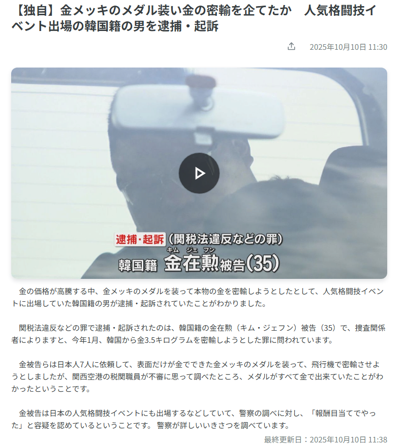 금도금 메달이라 우기고 밀수하던게 걸렸고
