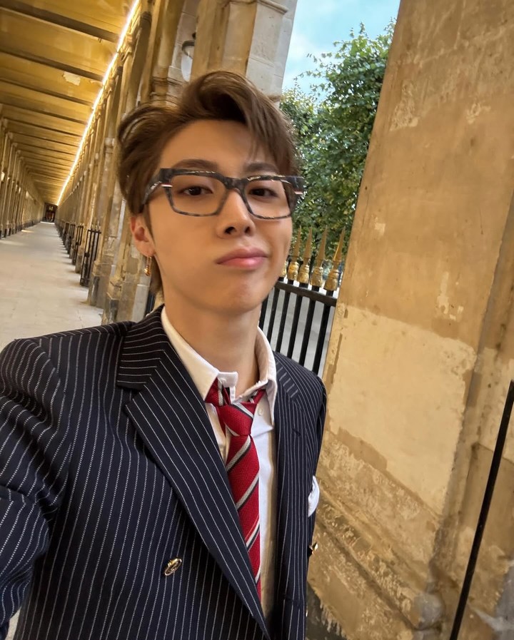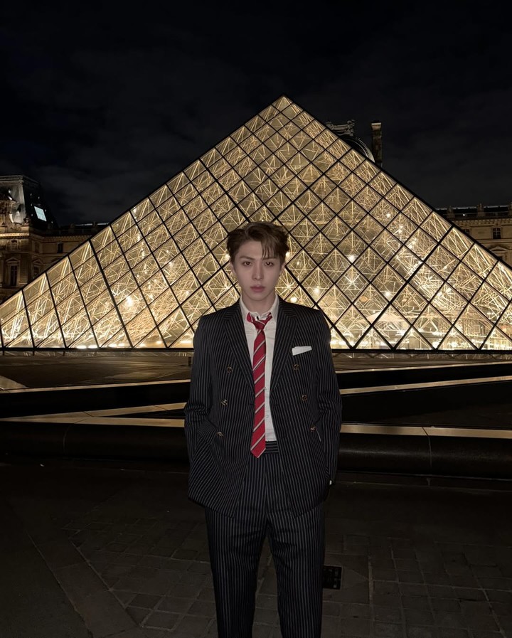 곱게 넘긴 헤어 스타일과 안경, 그리고 금빛 조명 아래 루브르 피라미드를 배경으로 서 있는 우찬의 모습은 영화 속 한 장면을 그대로 옮겨 놓은 듯한 분위기를 자아냈다.