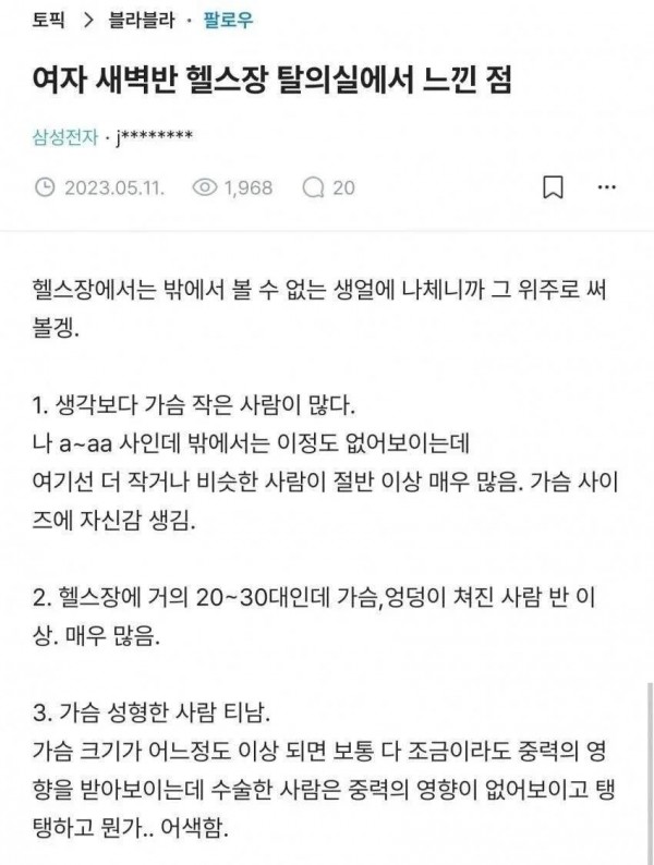 삼전 누나가 헬스장 탈의실에서 느낀점