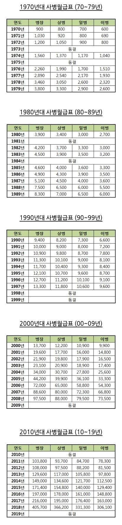 그 시절.. 옛날 군대 사병 월급표