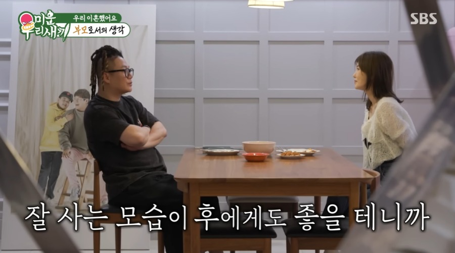 짐을 나누고 두 사람은 식탁에 앉아 밥을 먹었다. 윤민수는 "집에서 단 둘이 먹는건 10년이 된 것 같다"라고 이야기했고, 김민지는 "이 식탁에 둘이 앉아보는 것도 처음인 거 알아?"라고 덧붙였다. 이에 윤민수가 "그게 문제다"라고 말하자, 김민지는 "우린 싸울 때만 이 식탁에 앉아있다"라고 맞장구 쳤다.