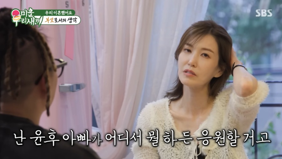 김민지는 "나도 그렇다. 윤후아빠가 꼭 내아들 아빠가 아니라고 해도, 우리 20년 같이 살지않았냐. 20년 같이 살면 가족이다. 난 윤후아빠가 어디 나가서 뭘하든 계속 지지할거고 응원할거고, 축하할 일 생기면 축하할 거다"라고 답했고, 윤민수는 "그거야 너랑 나랑 똑같지"라고 고개를 끄덕였다.