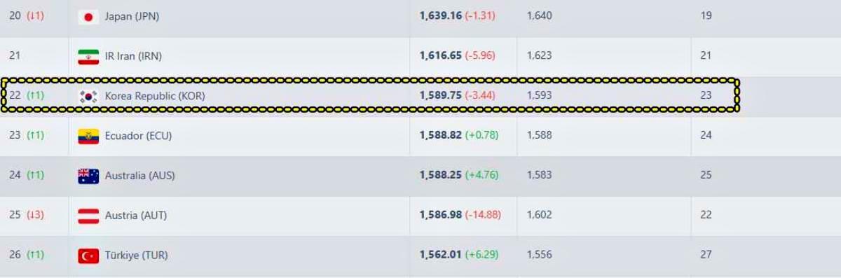 지난 10일 브라질전 0 대 5 대패 이후 국제축구연맹(FIFA) 랭킹이 한 계단 끌어올려지는 대이변이 대한민국 축구 대표팀에게 일어났다. A매치 결과를 실시간 반영하는 풋볼 랭킹 집계에 따르면 13일(현지 시각) 대한민국 FIFA 랭킹은 23위에서 22위로 상승했다. 브라질전 패배로 랭킹 포인트가 3.44점 깎였지만, 동시간대 유럽예선에서 벌어진 변수들이 한국에 유리하게 작용했다.