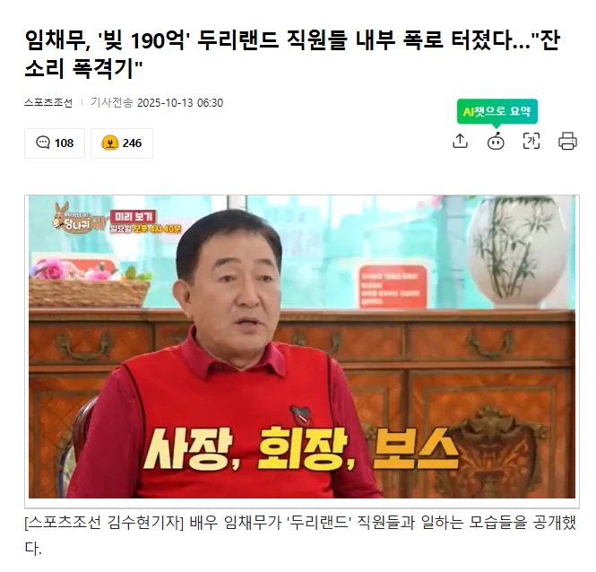 임채무, '빚 190억' 두리랜드 직원들 내부 폭로 터졌다..."잔소리 … | 스포츠조선 폐 수술후 알게된 충격적인 사실카카오 홍민택 CPO 뉴스에 뜬금없이 짤까지 같이 나온 사람이혼한 윤후 부모가 서로 가져가겠다고 한 사진남자는 능력임을 보여주는 곽튜브 인스타 결혼식 사진ㅂㅅ겜 소리 듣던 디아블로 4 근황