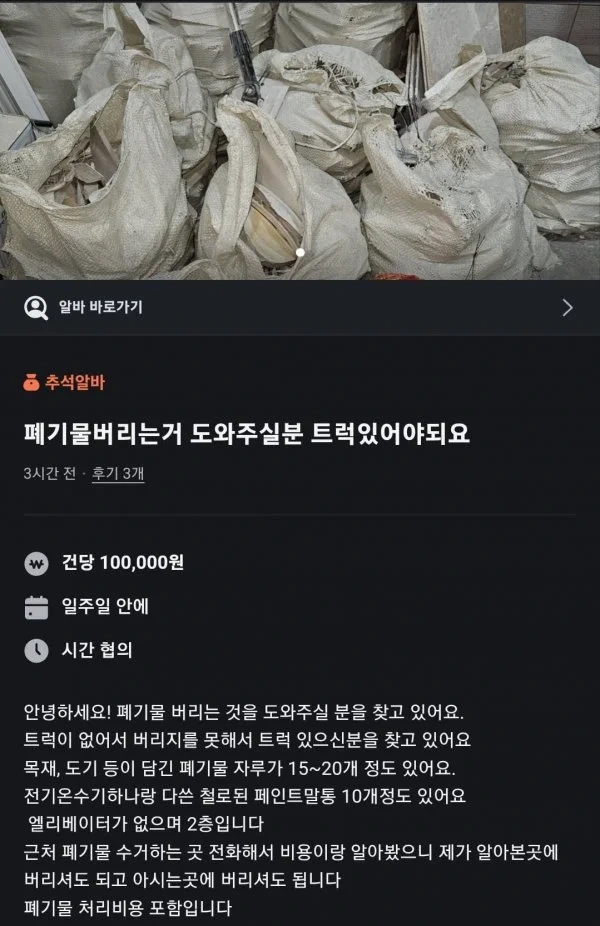 트럭 비용+ 폐기물 처리비용 만 해도 10만원 더 나올텐데 다 알아봤다는 새끼가 저 가격에 올릴 생각을 하냐 진짜 저건 무지가 아니라 존나 얌체짓이지 내 나이 28 자취하는데 집 오시더니 CCTV 달아버림장인어른 시력검사 해주는 사위애견 키우다가 유기하는 가장 큰 이유 중 하나전세보증금 돌려받기 힘든 이유팬들이 작가가 대필이나 ai를 하라고 애가 타는 만화