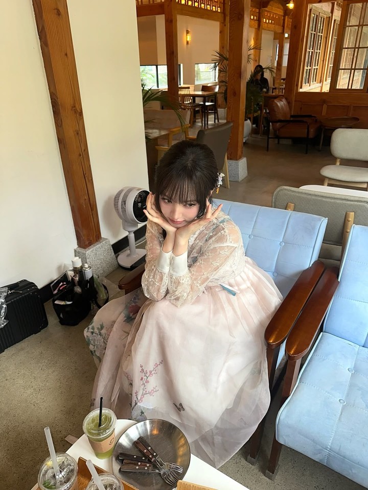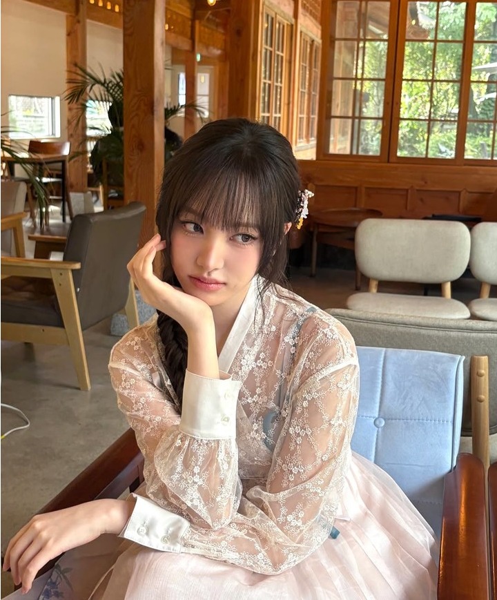 공개된 이미지에서 리즈는 핑크빛이 감도는 치마와 레이스가 덧대어진 시스루 한복 재킷을 매치해 단아하면서도 신비로운 매력을 한껏 발산했다.