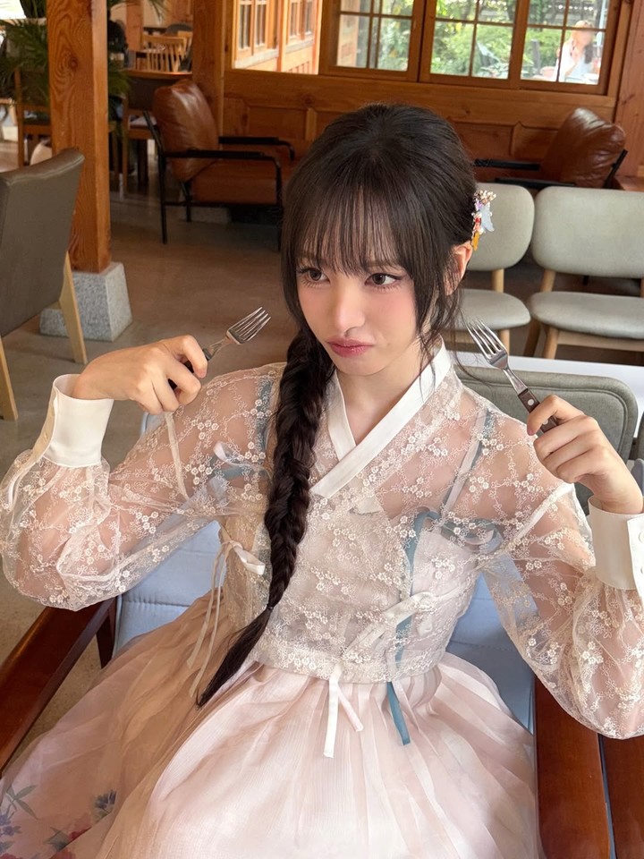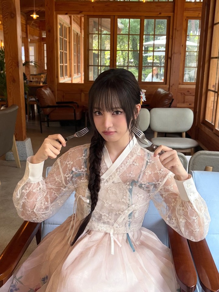 이어진 사진에서는 포크를 들어 장난스러운 표정으로 색다른 분위기를 연출했으며, 흑발의 땋은 머리와 화사한 꽃 장식이 더해져 우아하면서도 맑은 미모가 돋보였다.