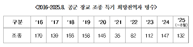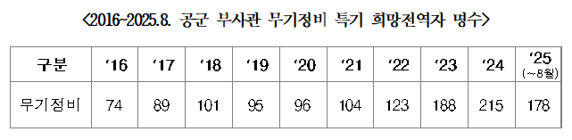 국회 국방위원회 소속 황명선 국회의원(논산·계룡·금산)이 공군으로부터 입수한 자료에 따르면, ‘무기정비’ 특기의 공군 부사관 희망전역자 수는 2016년 74명에서 꾸준히 증가해 2024에는 215명으로, 무려 2.9배로 늘어났다.