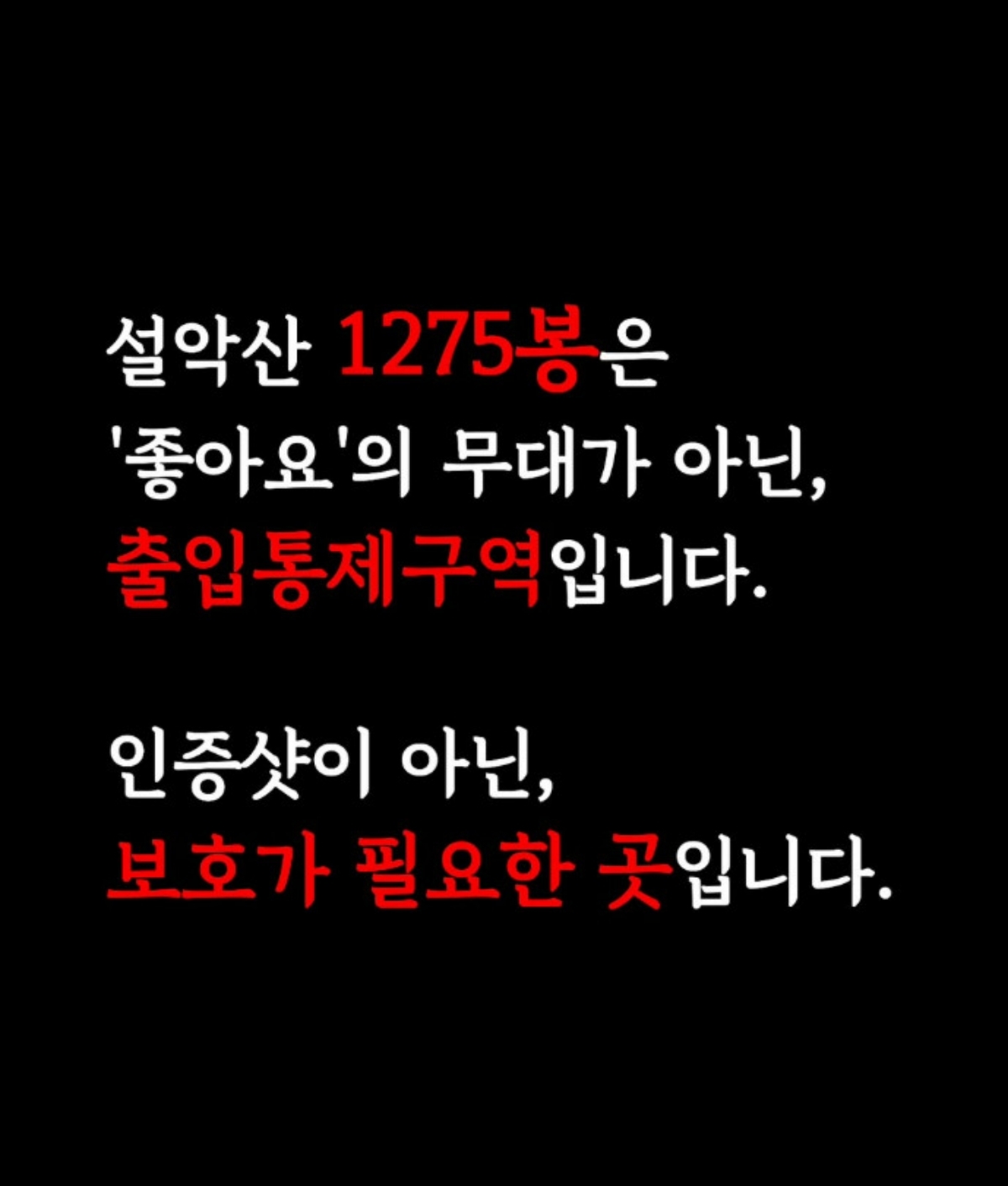그러면서 "1275봉은 ‘좋아요’의 무대가 아닌 보호가 필요한 곳이다. 우리에겐 책임 있는 탐방 문화가 필요하다"고 덧붙였다.