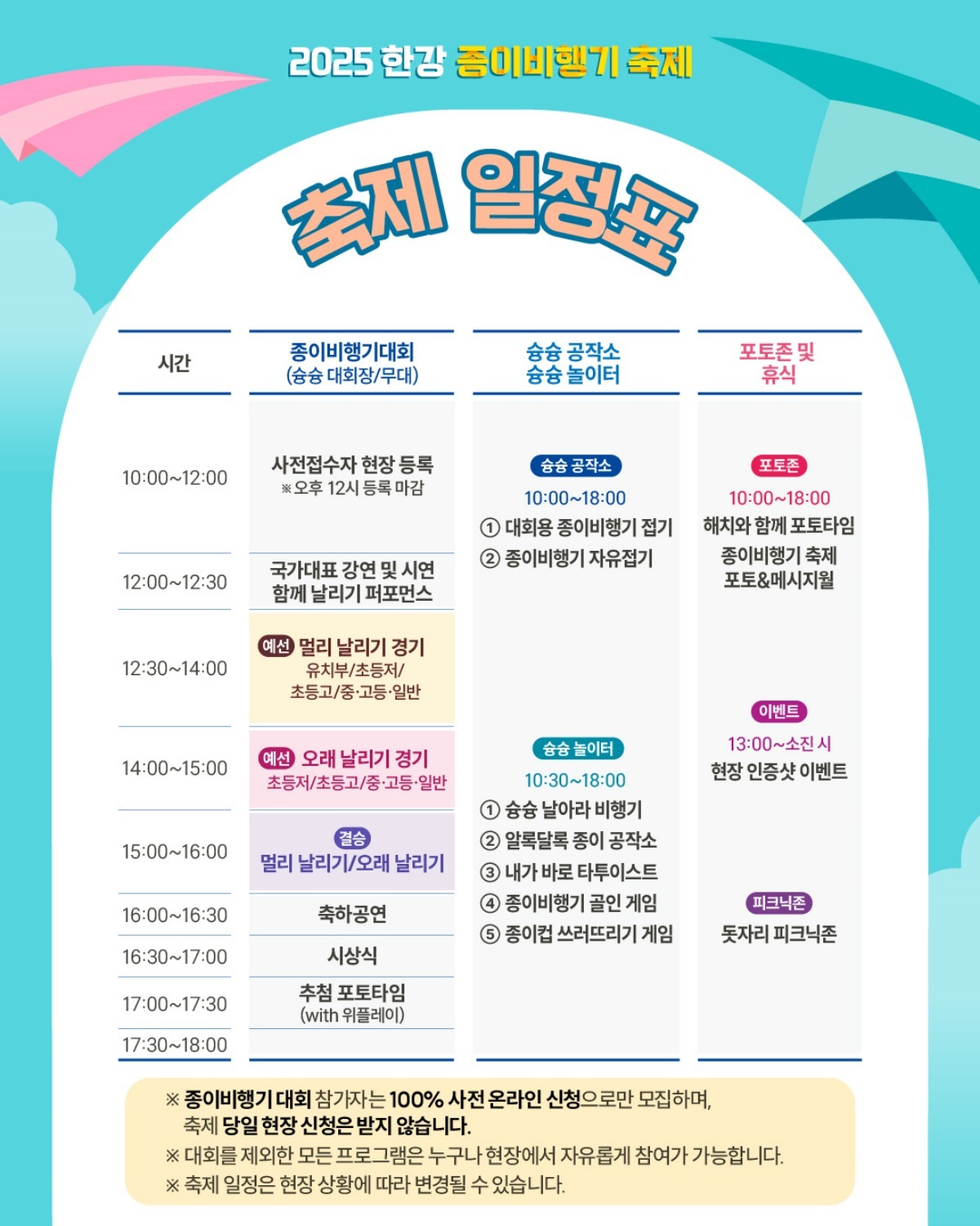 누구나 현장에서 참여할 수 있어 관람객에게도 특별한 경험을 선사한다. 오프닝 퍼포먼스로는 참가자들이 색색의 종이비행기를 함께 날리는 장면이 펼쳐지고 자유 접기와 비행기 날리기 게임, 부메랑 비행기 만들기 같은 여섯 가지 체험 프로그램이 상시 운영된다.