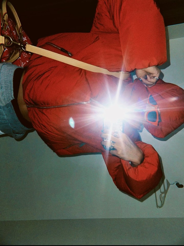 올데이프로젝트 타잔은 레드 패딩과 루이비통 가방, 그레이 트레이닝 팬츠를 조립해 실험적인 느낌의 새깅 패션을 선보였으며, 또 다른 착장에서는 블랙 워싱 팬츠와 심플한 티셔츠로 간결한 무드도 선사했다.