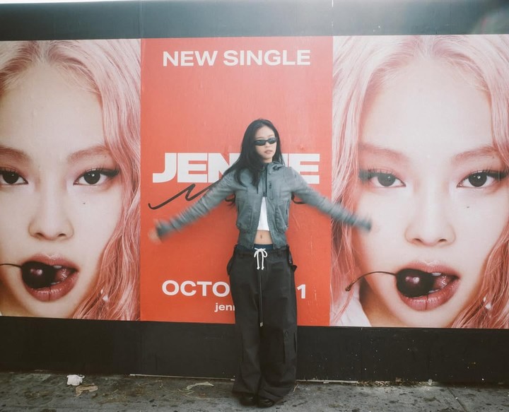 블랙핑크 제니는 두 가지 착장으로 각기 다른 새깅 스타일을 완성했다. 연습실에서는 스포티한 크롭탑에 블랙 트레이닝 팬츠, 그리고 붉은 로고가 보이는 언더웨어로, 또 다른 모습에서는 깊은 컬러의 와이드 팬츠와 그레이 크롭 아우터를 활용해 도심 속 스트리트 감성을 표현했다.