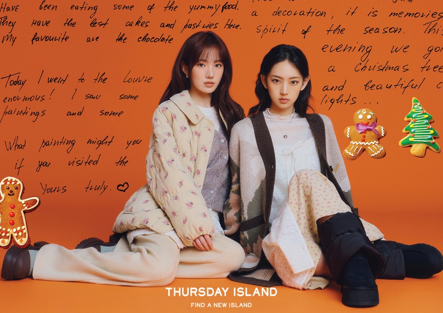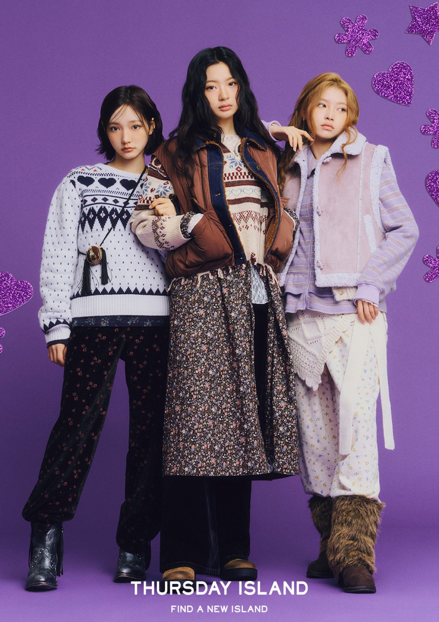 2025 FALL 시즌부터 써스데이 아일랜드의 뮤즈로 함께하는 키키(KiiiKiii)는 스타쉽 엔터테인먼트 소속 5인조 젠지미(Gen Z美) 그룹으로, 개성 있는 음악과 무대 퍼포먼스로 주목받았다. 이번 캠페인에서도 키키만의 영한 에너지를 화보 곳곳에서 담아내, 브랜드의 자유롭고 유쾌한 겨울 감성을 더욱 살렸다.
