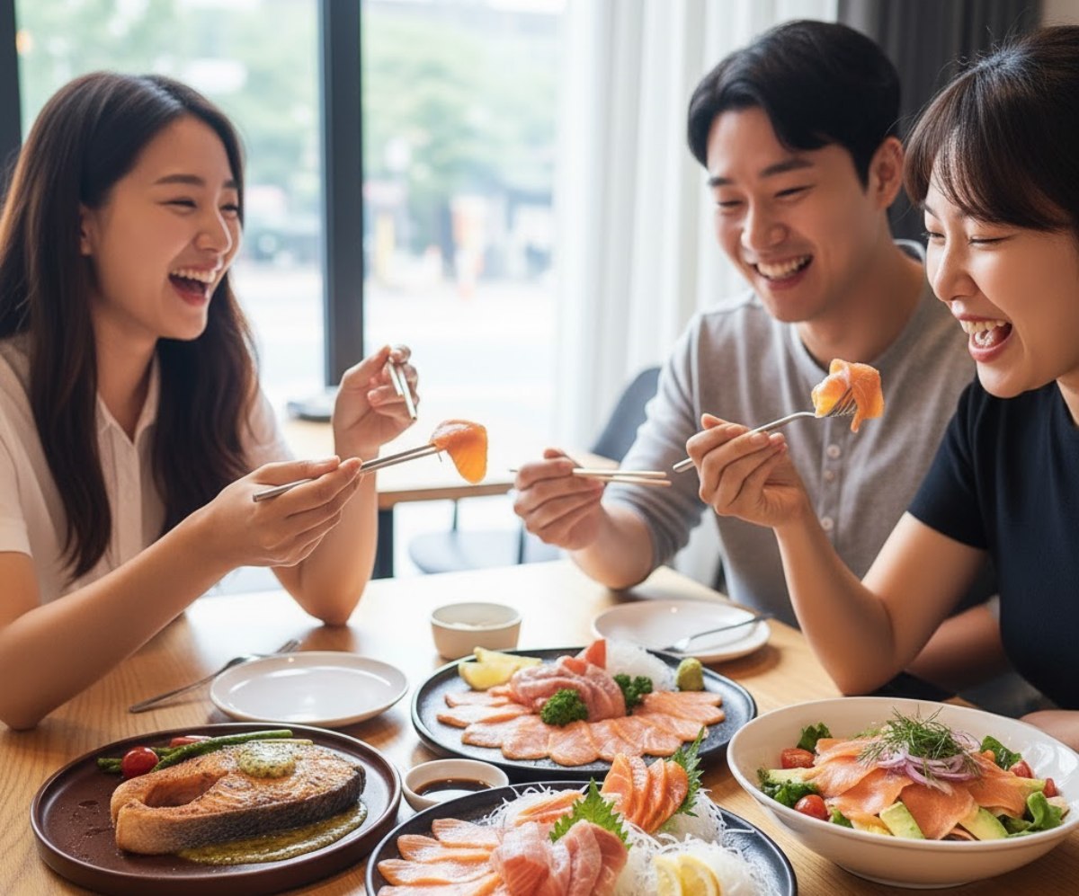 연어를 맛있게 즐기는 방법은 다양하다. 가장 기본은 회나 초밥 형태로 즐기는 것이다. 지방이 오른 가을철 연어는 특유의 부드럽고 고소한 풍미 덕분에 별다른 조리 없이도 깊은 맛을 낸다. 특히 살짝 숙성시킨 연어에 간장과 레몬즙을 곁들이면 지방의 느끼함이 줄고 감칠맛이 배가된다.