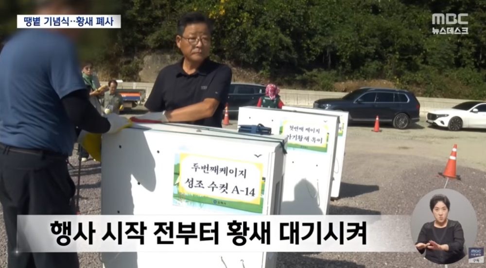 시장, 국회의원 등 참석자들의 연설 뒤 방사 일정을 잡았기 때문인데 황새들은 방사 직전까지 1시간 30분 이상을 좁은 새장에 갇힌 채 기다려야 했습니다.