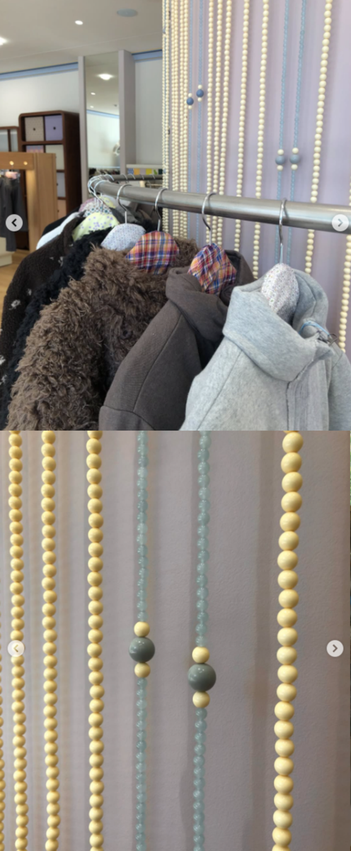 1층 공간은 의류를 전시하는 섹션으로, 벽면에는 비즈 장식이 이어져 동화적인 분위기를 연출한다. 옷걸이와 소품의 활용으로 인해 매장은 단순한 판매 공간을 넘어 하나의 작품으로서의 공간미를 보여준다.