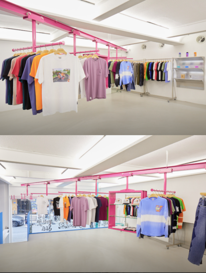 매장 중앙을 가로지르는 옷걸이와 일부 컬러 소품이 브랜드 특유의 자유로움과 개성을 한층 강조한다. 전체적으로 깔끔하고 캐주얼한 인테리어가 예스아이씨만의 분위기를 완성하며, 브랜드 콘셉트에 걸맞은 공간미를 연출한다.