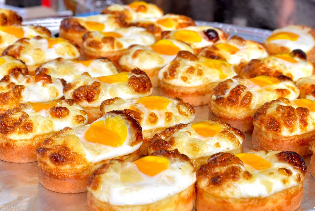 길거리 포장마차에서 흔히 볼 수 있는 계란빵은 이름 그대로 빵 반죽 속에 달걀을 통째로 넣어 구워내는 간식이다. 겉은 노릇하고 속은 촉촉해 달걀의 고소함과 반죽의 달콤함이 어우러진다. 한입 베어 물면 따뜻한 반숙 달걀이 부드럽게 퍼지고, 달짝지근한 빵의 풍미가 입안을 채운다. 설탕이나 파슬리 가루를 살짝 뿌리면 특유의 짭짤단짠한 맛이 완성된다.