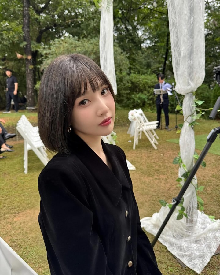 사진에는 야외 결혼식장에 자리한 조이가 블랙 벨벳의 버튼 재킷을 착용하고 있는 모습이 담겼다. 짧은 단발 헤어에 자연스러운 메이크업, 골드 이어링을 더해 세련된 스타일을 완성했다.