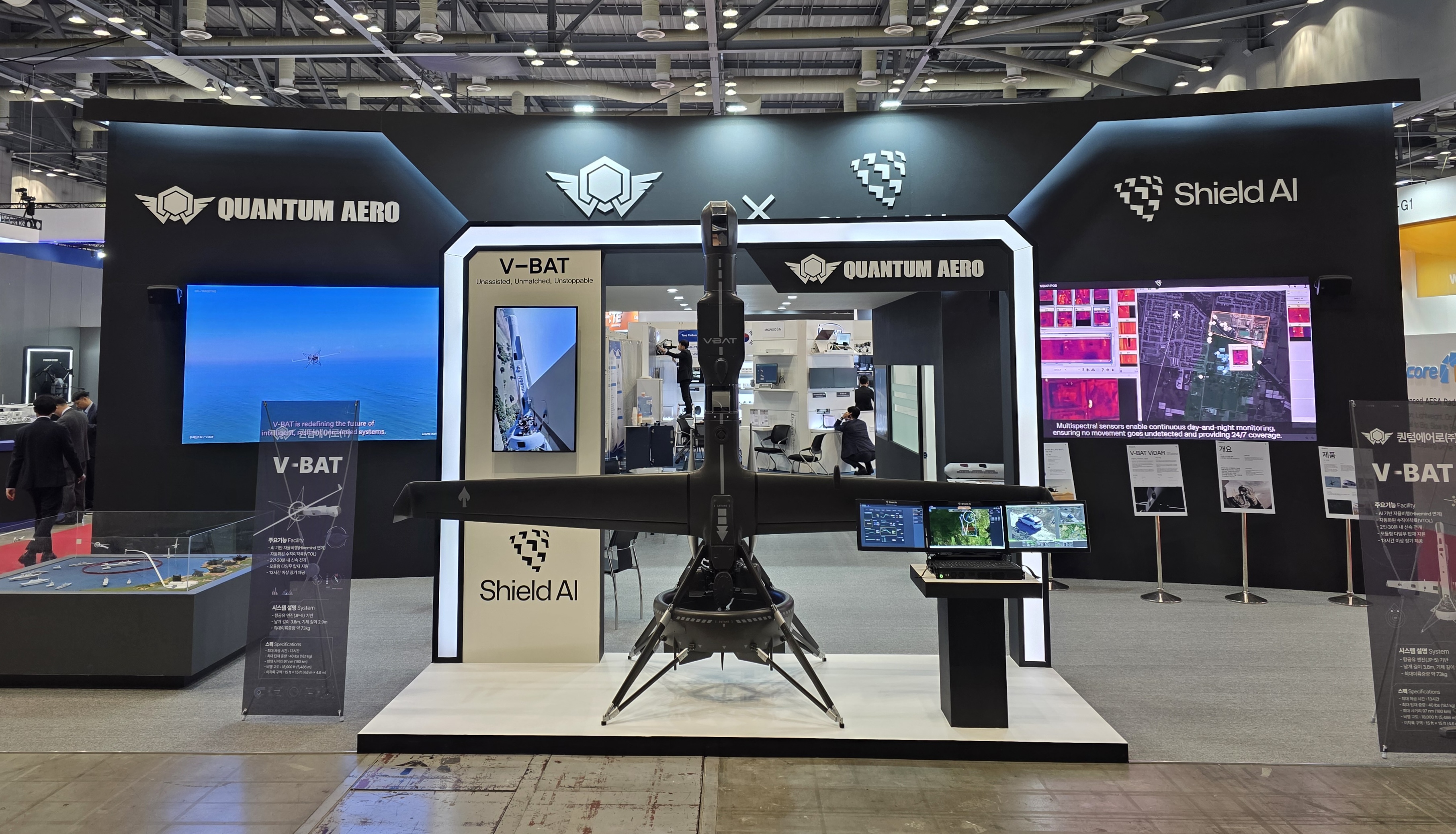 이번 전시에서 퀀텀에어로는 Shield AI와의 기술 협력을 통해 국내 체계 개발 중인 AI 기반의 SATCOMs 통신형 ‘V-BAT’ 수직이착륙 무인기를 업그레이드 버전으로 선보인다. 또한 실제 전장을 구현한 AI 전투체계 디오라마 전시를 통해 자율항공체계가 전장 내에서 어떻게 작동하는지를 시각적으로 보여주며, 국내외 바이어들의 이해와 관심을 높일 예정이다.