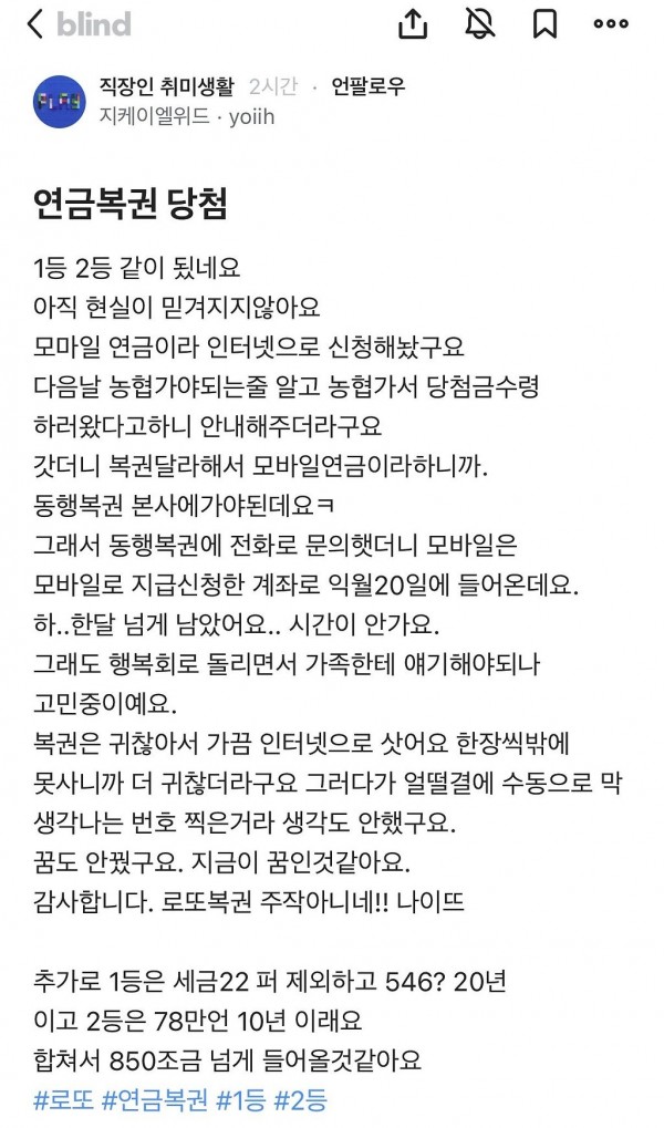 연금복권 1, 2등 인증한 블라인