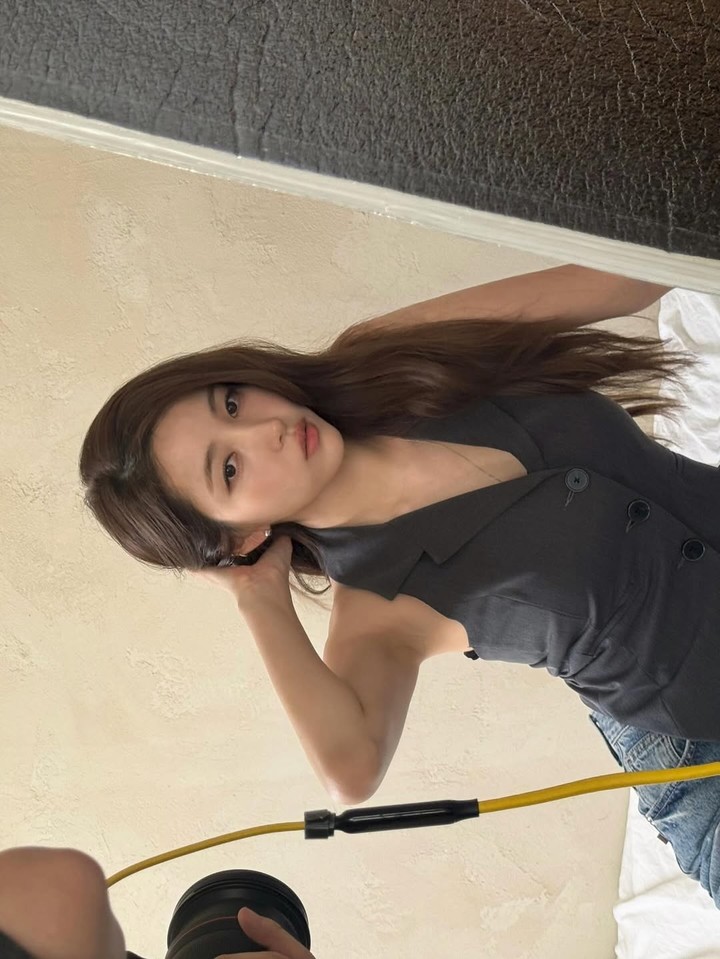 또 다른 사진에서는 버튼 장식이 돋보이는 베스트와 데님을 조합한 모던한 코디로 도시적인 스타일을 표현했다.