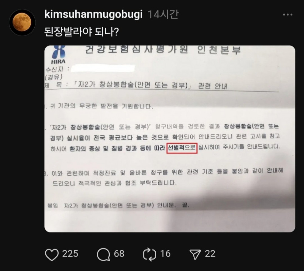 적당히 하라고 꼽주는 안내문 얼굴/목은 다른 부위보다 까다로워서 봉합술 안해주는 곳 많은데 그런 환자들 거부안하고 꿰매주면 "너 왜 다른데보다 많이해?" 라고 심평원에서 꼽줌 한씨 여배우 떠올리면서 들어와 봐30년 건달생활 은퇴후 유튜브 시작한 남자대구에서 발령받아 온 동갑 여직원아무도생각못한 이순신 ㄹㅇ 개쩌는점도예공방 앞 도자기들을 모조리 깬 범인