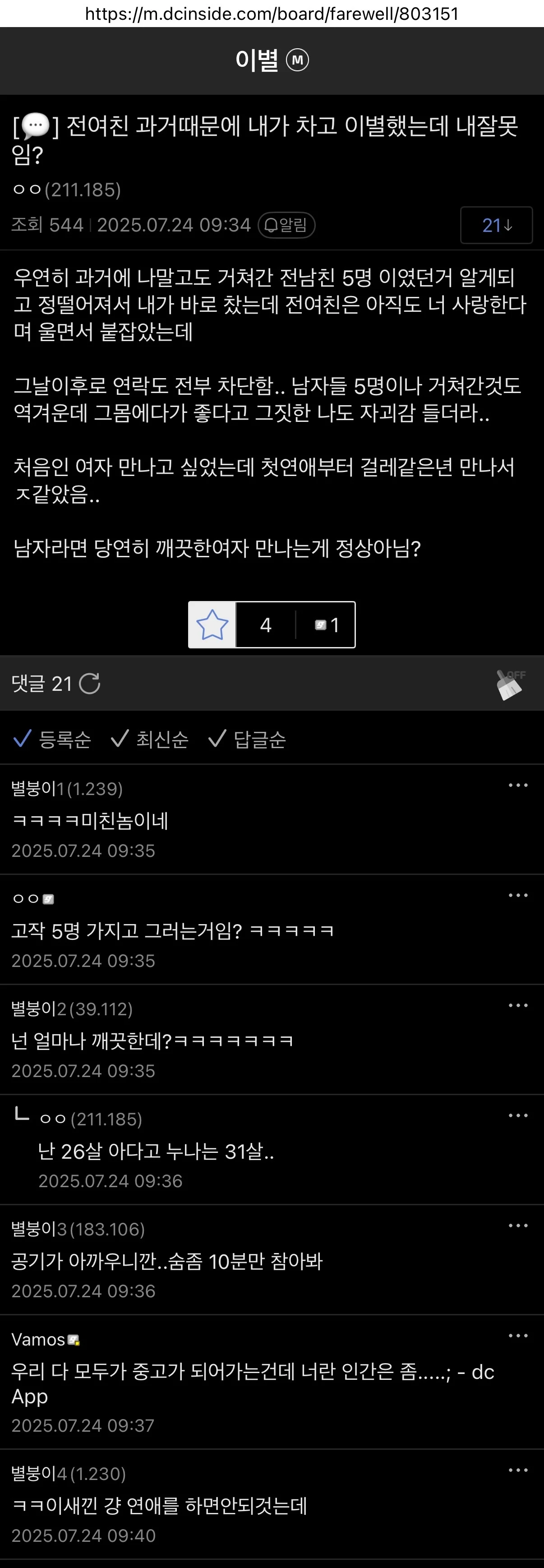 댓글보니 글쓴이는 26살 남자인것 같은데 여자나이 31살에 5명이면 많은건가? ㄷㄷ... 여친쪽은 거의 누나뻘 인데 남자가 너무 어려서 저러나? 요즘 연상연하 커플 많은듯 눈에도 침 놓는다는 100년 된 한의원400억 자산에도 168cm 키작남이라 결혼 못 하는 남자북한 여자 역도선수 피지컬성격 좋은 오타니도 개빡치게 만드는 방송국인성을 떠나서 존잘 맞다 vs 아니다