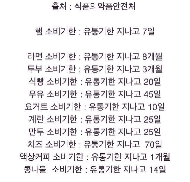 출처:식품의약품안전처 현재 유통기한에서 소비기한으로 바꼈습니다 2021년 8월 식품위생법 및 식품 등의 표시 광고에 관한 법률 개정으로 인해 정식 법정 용어가 유통기한에서 소비기한으로 개정되었으며, 법적 효력이 실제로 발효된 2023년 1월 1일부터 가공식품 등의 표시기준에 '소비기한'이라는 용어가 사용되기 시작했다. 유튜브에서 자연스럽게 ppl하려고 쌓는 빌드업 수준공무원 보고서 결재 받을 때"노예 없다고 했는데.." 신안은 '감옥'이었다오늘 엠카운트다운 1위 먹은 걸그룹엘리자베스 2세 여왕 방한 당시 두 기업의 신경전