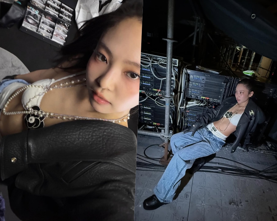 공개된 사진 속에는 월드투어 백스테이지 현장이 담겨있다. 사진 속 제니는 브라탑에 와이드 데님팬츠, 그리고 블랙 가죽 재킷을 매치하며 카리스마 넘치는 무대 스타일을 완성했다. 허리라인을 드러낸 과감한 실루엣에 샤넬 로고 벨트와 진주 네크리스가 더해져 럭셔리하면서도 거침없는 무드가 돋보인다.